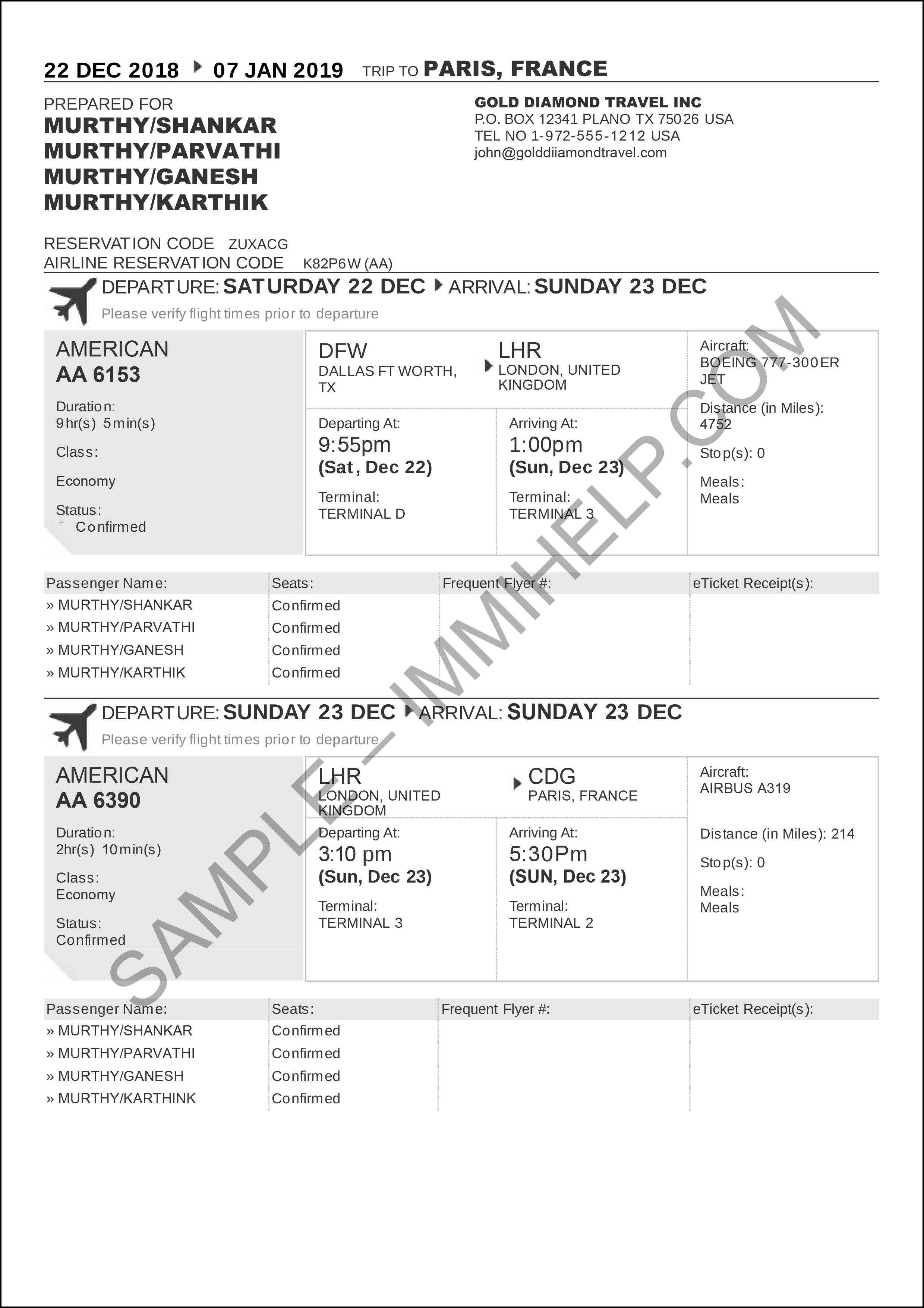 The flight itinerary would show your name and the flight number, airport codes, the date, the time, and the duration of each flight. You must show the flight itinerary for your round-trip journey and not an open or one-way journey.