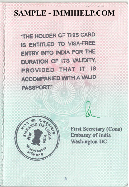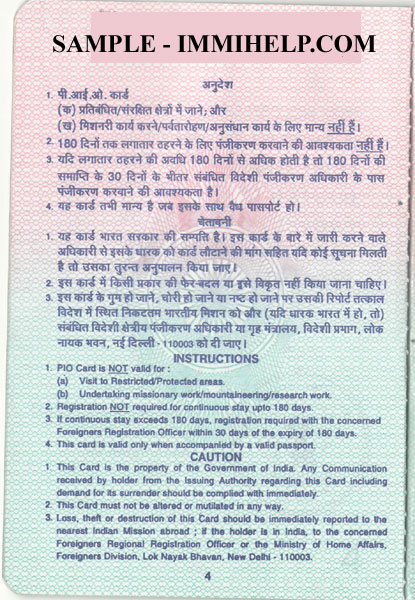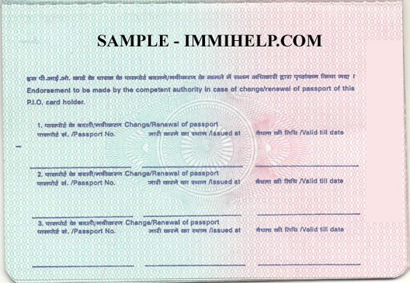 Here is the sample PIO card booklet. Unlike OCI, there are no visas stamped in the passport. You carry your passport and PIO card to travel to India.